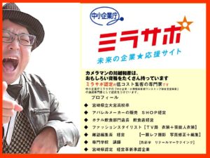 カメラマンの川越和彦は、おもしろい資格をたくさん持っていますミラサポ認定の低コスト集客の専門家です中小企業庁ミラサポの「中小企業・小規模事業者ワンストップ総合支援事業」の派遣専門家として認定をうけています。